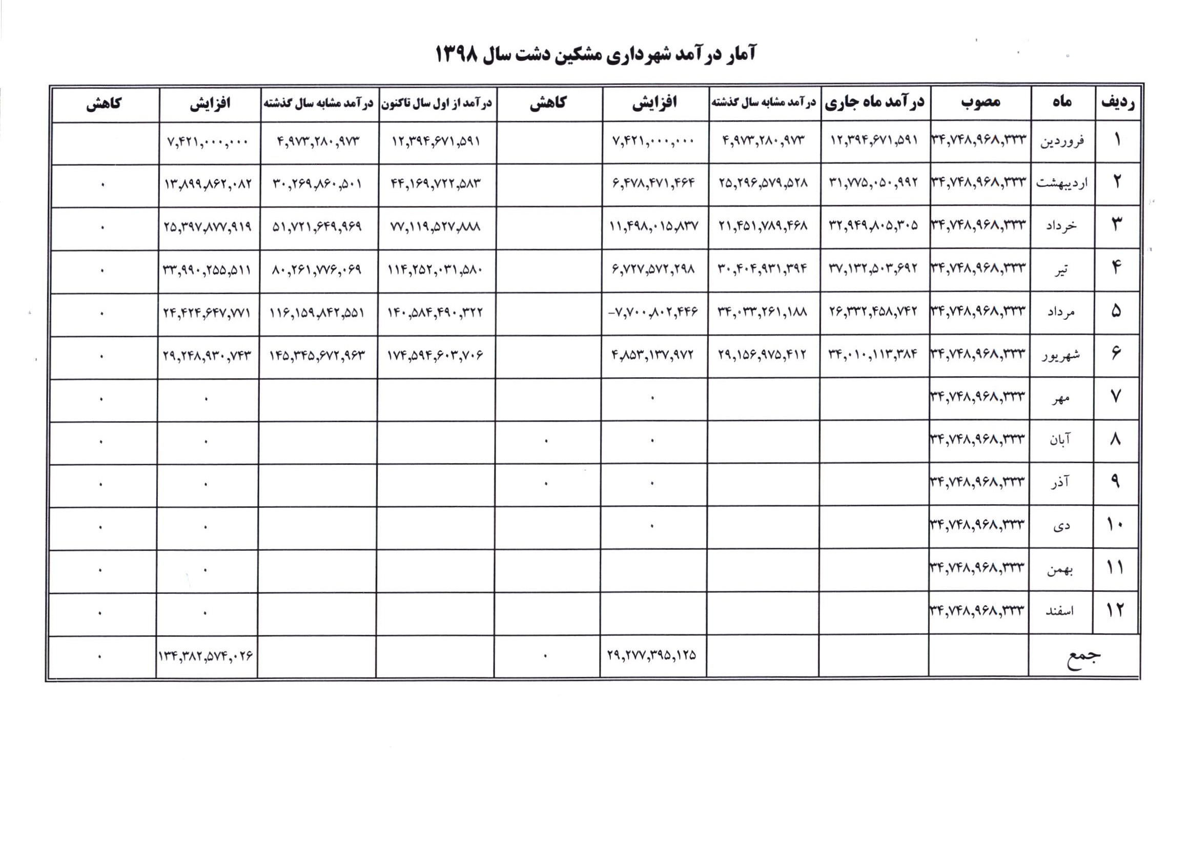 به گزارش پایگاه اطلاع رسانی شورای اسلامی شهر مشکین دشت در راستای اطلاع رسانی عمومی  آمار درآمد و هرینه کرد شش ماهه اول سال جاری جهت آگاهی عمومی منتشر شد.