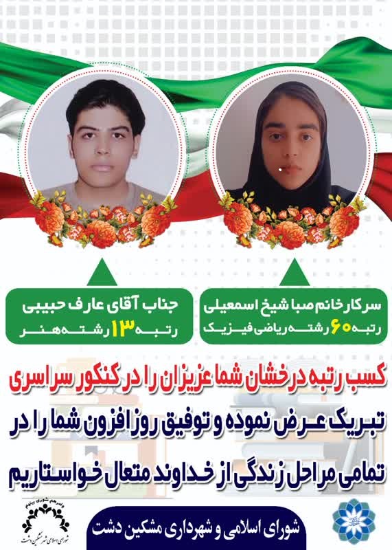 کسب رتبه درخشان شما عزیزان رادر کنکور سراسری تبریک عرض نموده و توفیق روز افزون را در تمامی مراحل زندگی از خداوند متعال خواستاریم