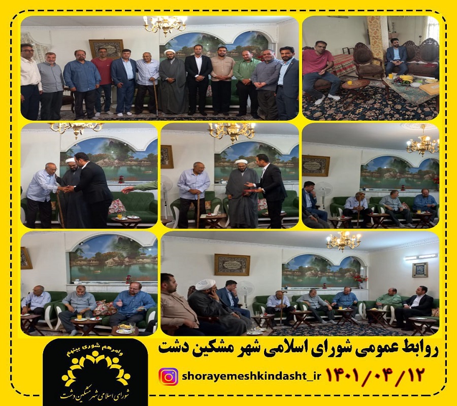 عصر دیروز ۱۲ تیر ۱۴۰۱ دکتر احمد کریمی پور رئیس، آقایان دژکام و فیض الهی عضو شورای اسلامی شهر بهمراه مهندس صفرخانلو شهردار مشکین دشت ، آقایان محمد افشار، حاج احمد رضایی دو عضو سابق شورای شهر، حجت الاسلام و المسلمین قدوسی و تعدادی از پرسنل شهرداری با حضور در منزل حاج حسین لطفی نژاد از معتمدین و پیشکسوتان شورای محلات مشکین دشت دیدار و از زحمات بی شاعبه ایشان تجلیل کردند.